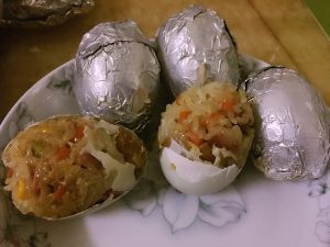 把腌好的糯米馅填入鸭蛋中,八九分满