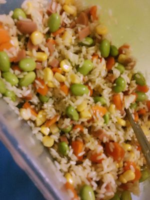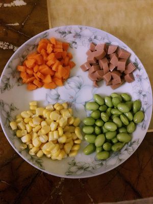 火腿肠切丁、胡萝卜切丁、玉米粒洗净、青豆焯水