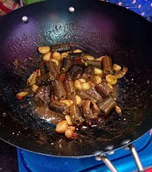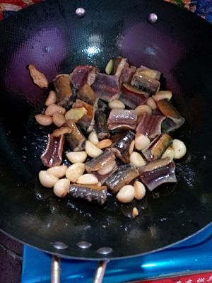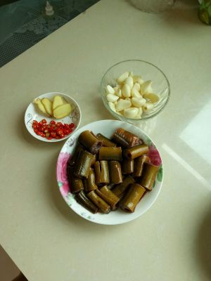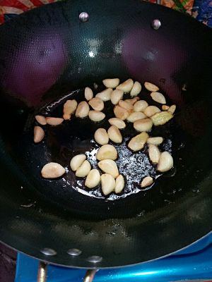 把锅子烧热,倒入油,下姜片和蒜子煸成金黄