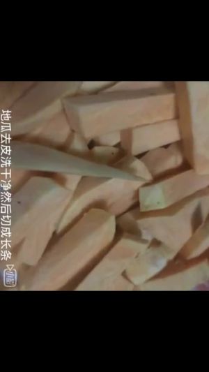 第一步:把地瓜去皮洗干净切成长条(自己在家里做着吃,我也没切那么整齐,如果切的方方正正会剩下许多边角料,那样是浪费。)
