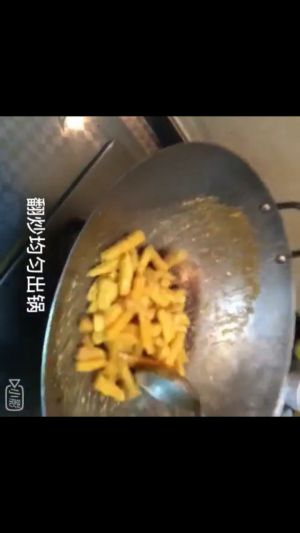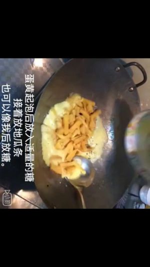 第六步:这时的蛋黄也蒸好了,把蛋黄剁碎,越细越好,开火放少许油放入蛋黄然后一直搅动,待蛋黄出沫时放白糖和地瓜条翻炒几下出锅即可。