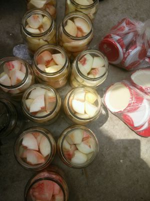 装好桃子就可以倒入糖水了!