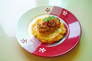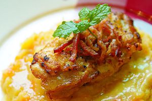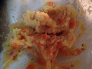 把土豆、番薯、胡萝卜捞起,加入少许汤汁压成泥。然后加入黑胡椒、白葡萄酒醋、培根碎、煎过培根和鸡腿的油,混合均匀