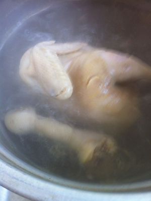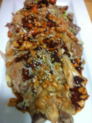 童子鸡一只煮熟取两个大腿改刀切条块码盘。