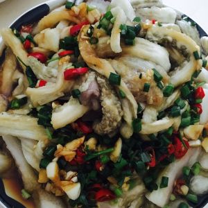 将蒸好的茄子放凉后,不要茄子皮。把茄肉撕成这种条。