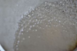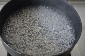 水烧开下西米,不加盖一直煮到西米外面透明,中间剩下一粒白点,关火焖到白点消失,不要焖太久。