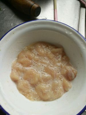 接着,把肉切丁,加入盐,料酒,生粉进行腌制一刻钟左右。