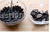 将奥利奥饼干扭开,刮去中间奶油,将其中三分之一掰成小块,另外三分之二用擀面杖碾碎,倒入溶化的黄油中拌匀;
