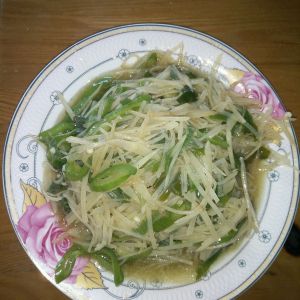 第五步,放土豆丝,翻炒,到透明状,倒入醋,继续翻炒