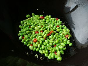 锅烧热,倒油,下辣椒和毛豆翻炒。
