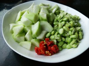 丝瓜去皮,切成小的滚刀块。毛豆剥去壳,辣椒切成小段。
