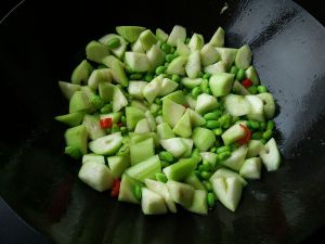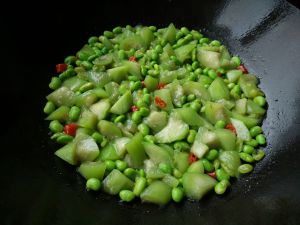 等毛豆颜色变深,皮有点皱时加入丝瓜一起翻炒。