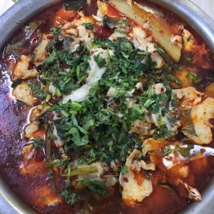 低汤继续烧滚,倒入鱼片,滑鱼片,鱼片加入,煮沸,一二分钟,然后端起锅,一起倒入之前放蔬菜的不锈干盆里,撒上香菜