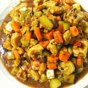 加入鸡丁,黄瓜,胡萝卜,翻炒片刻,加入生抽,老抽,醋,糖,淀粉和水兑成调味汁