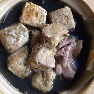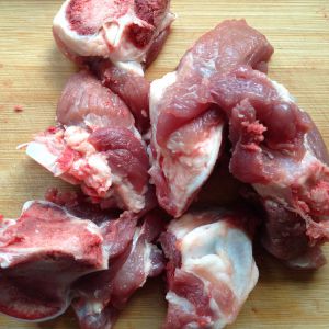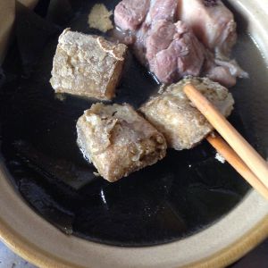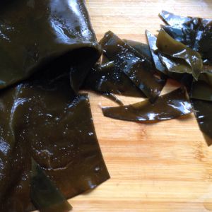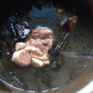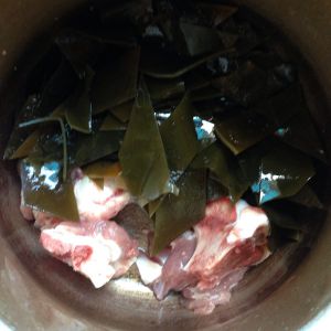 海带,筒骨放入高压锅,加水,加2片姜,倒入适量料酒。放至煤气灶上煮,上气后,小火半小时