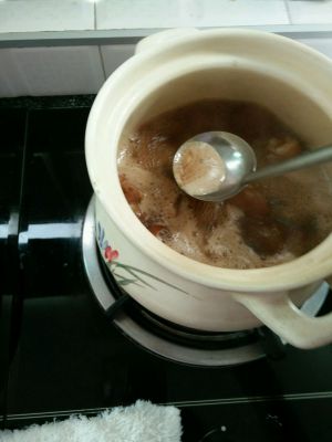 把猪猪蹄放到沙锅里,加热水大火煮开,上面还会有沫沬,把它漂出,把火关小,慢慢煲。