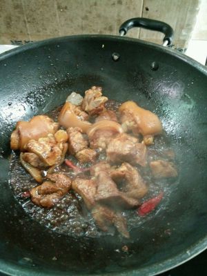猪蹄焯水洗净,锅里放点底油,在把姜、八角、桂皮、辣椒、花椒、冰糖放入锅里,在放猪脚炒香微黄,加料酒在炒一下,在加生抽炒一下。