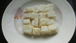 切小块,外面裹椰蓉。宝宝很喜欢。微甜。