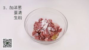 在腌好的羊肉上面均匀撒上一层生粉抓匀,加入蛋清和洋葱,搅拌均匀。