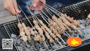 烤羊肉时碳火不要太大,如果火大可以把碳拨到一边,用少量的炭火烤肉,烤肉时把羊肉串上的洋葱抖掉。