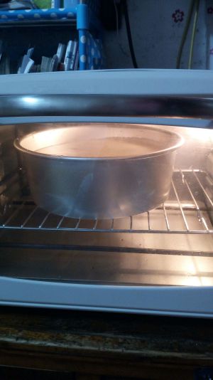 6.全部搅拌好倒入8寸模具里,震动几下,震出气泡放入烤箱,烤箱上下火130度,烤50分钟。