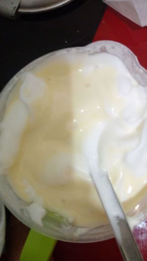 5.蛋黄中放入打发的蛋白,蛋白分3次放入蛋黄液里,一定要上下搅拌。