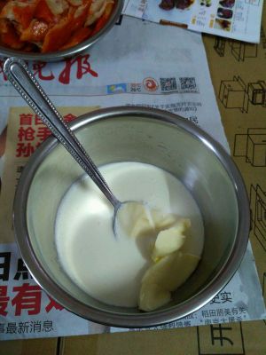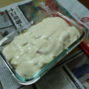 将饭放入加热碗里,然后将打发好的芝士奶油铺淋在上面,上面说不要太粘稠,是为了铺淋的时候更方便,经过我做了那么多次,这张图片做得最好,不会粘稠到结成一块,也不会太稀薄到全部渗入饭里
