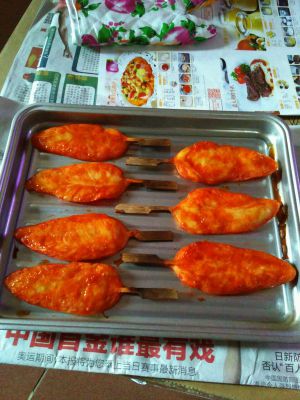 烤盘涂上一层油,放6~7块鸡柳,放在烤箱中层,210℃上管发热,20分钟,中间拿出来反一下。