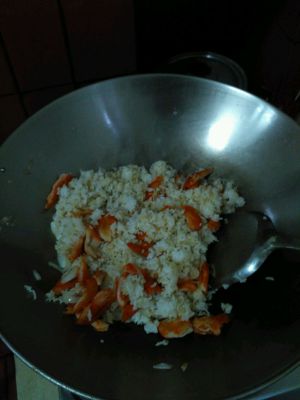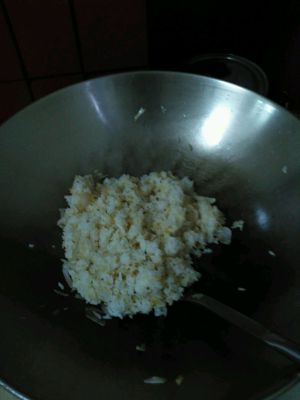 然后就是炒饭,放一块黄油,小火融化。然后放洋葱,不要问为什么只放洋葱,家里只有洋葱。炒爆洋葱后就加上饭,再加豉油,最后放黑椒粒,小炒一下熄火。