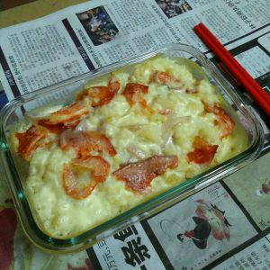 放进烤箱中层位置,上下管190℃烤12~15分钟,我是15分钟。,最新编辑过的成品,这个简直就是焗饭界的一股清流,原本铺在上面的奶油,经过加热,慢慢融化在饭里面,吃起来满满的芝士奶香,那种口味我无法形容,正常的焗饭吃多了,这个简直是小清新,特别是这样的炎夏,配上一支冻饮,绝对爽