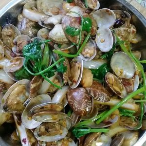 将开水焯开壳的花蛤倒入锅中翻炒30秒后,加入洋葱和蒸鱼豉油等进行翻炒。