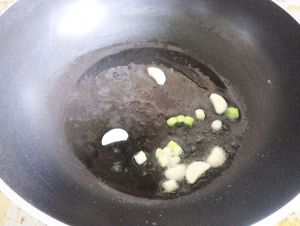 热锅放油,放入葱白和蒜片小火煸出香味。