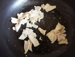 热锅放油,放入鸡胸肉小火炒至变色后盛出备用。