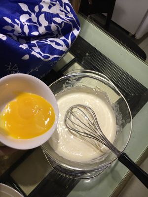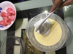 打发后的蛋清,先把1/3的蛋清加入面糊上下搅拌,再把剩余的搅拌均匀。然后在烤盘里加水预热,如果是活底的模就要加个架子防止进水,先160度烤20分钟再130度烤50分钟。如果看蛋糕快要开裂了就要往烤盘里加一小杯冷水。