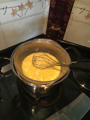 隔水加热,让黄油和奶油奶酪融化,加入牛奶,用打蛋器像打蛋一样打到混合成顺滑的糊状。