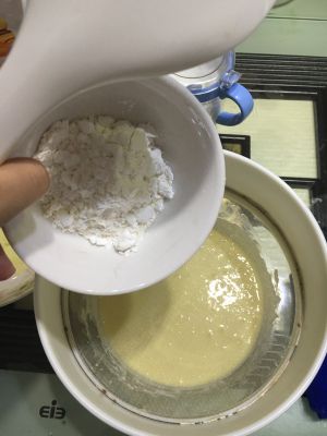 把低筋面粉和玉米淀粉分两次筛入面糊里搅拌均匀。