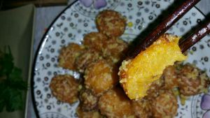 过油炸,把蛋黄划出细细的沫,挂上就好了