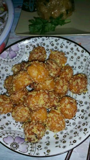 本来想做蛋黄焗南瓜的,但是南方面瓜跟我家的不一样,焯一下就碎了,被我做成南瓜球了,