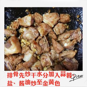 热锅热油加入排骨炒干水分,加入蒜蓉炒香,然后加适量盐和酱油一起炒至金黄色