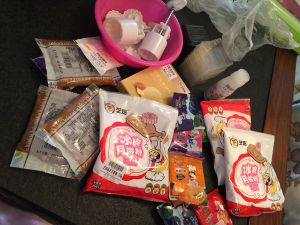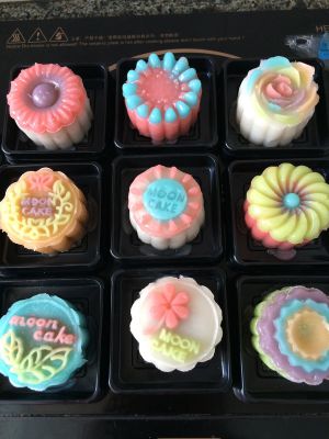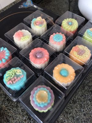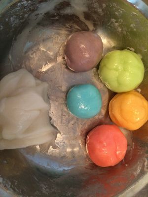 分团子,自己调颜色,我是调了这么几种颜色,另外一边称好馅料,戳好团子,没团馅料25克,皮也是25克,然后自己把颜色填进模具里,个人喜欢吧