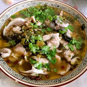 把焯过水的鱼倒入酸菜汤锅里煮两分钟装盘,酸菜鱼就做好啦,鲜香华嫩的鱼肉酸爽开胃。