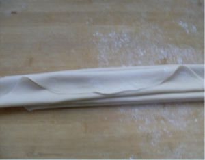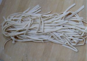 将饧好的面团擀开成均匀的薄面皮, 铺撒面粉防粘, 叠起, 用刀切成粗细均匀的面条.抖散晾开。