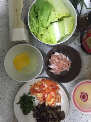 材料准备,肉切丝,西红柿切小块,木耳切碎,香葱切葱花