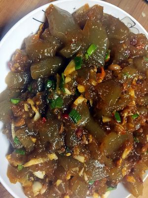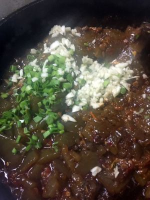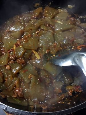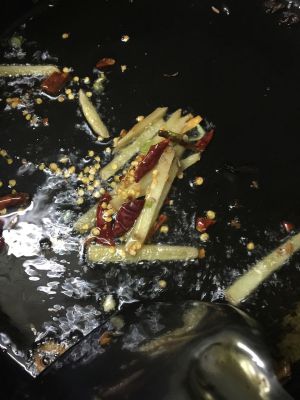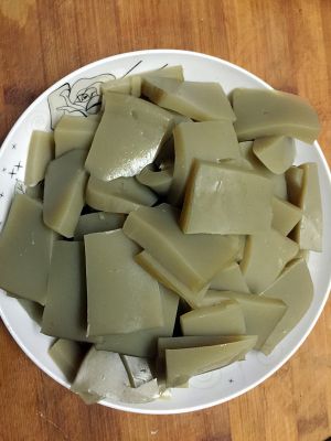 放凉粉炒3分钟左右,放豆瓣酱,我放的是自己家做的瓜豆酱!继续翻炒