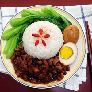 米饭倒扣,将卤蛋切成两半,然后浇上卤肉美味即成!