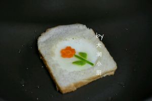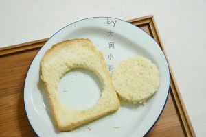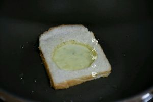 4.锅轻轻烧热,放入面包片,打入蛋白,蛋黄不用。