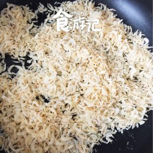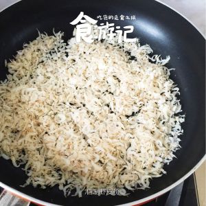 将沥干水分后的虾皮倒入平底锅,用小火,切记一定要小火