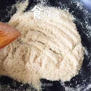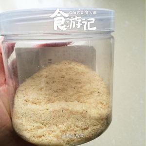 磨成粉末状的虾皮最后再次倒入平底锅内,反复翻炒至水分变干,颜色变黄,闻到一股香香的虾皮味儿✌️