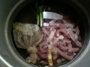 锅里放水发卤料包 葱结 姜块 料酒 盐 水开后加入牛肉 水开后撇去浮沫 小火继续煮45分钟