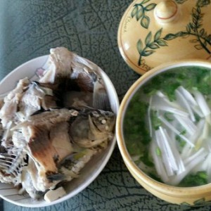 顿大约二十分钟左右,汤泛白就可以,放些胡椒粉出锅,我是把鱼和汤分开了!又撒上些葱和香菜,由于我爱吃胡椒粉,所以每次都是放的多一些,美味啊!
